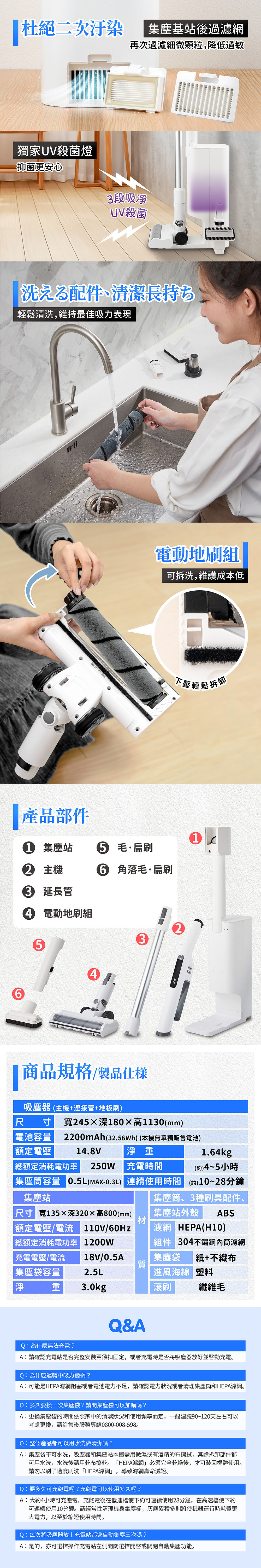 *配件:主機、集塵站、延長管、電動地刷組、毛扁刷、角落毛扁刷、集塵袋